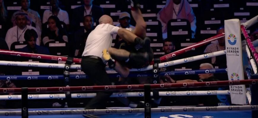 Британские полутяжеловесы устроили захватывающий и равный бой в Саудовской Аравии, когда они оба перевалились через верхний канат, словно в профессиональной борьбе.