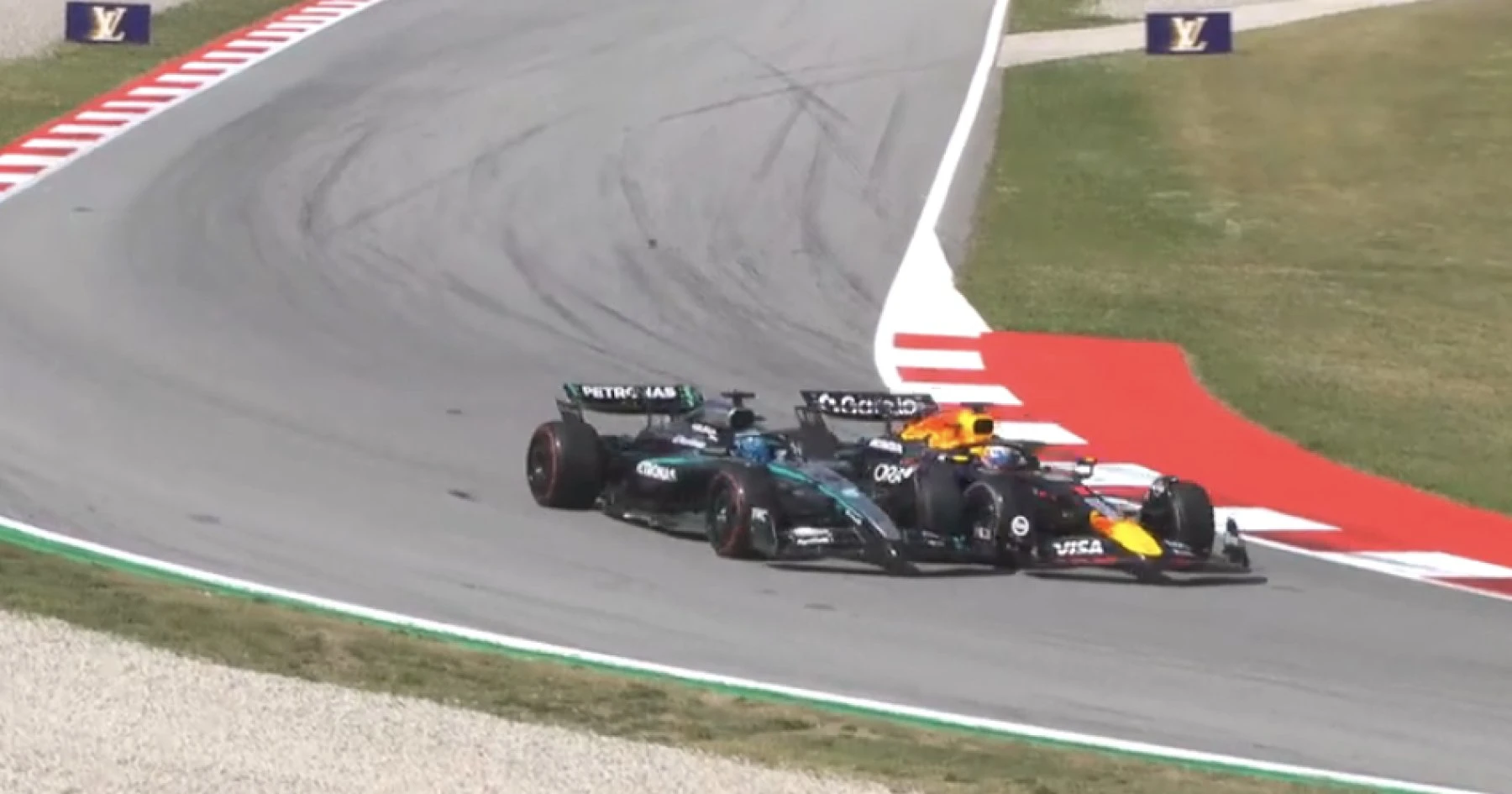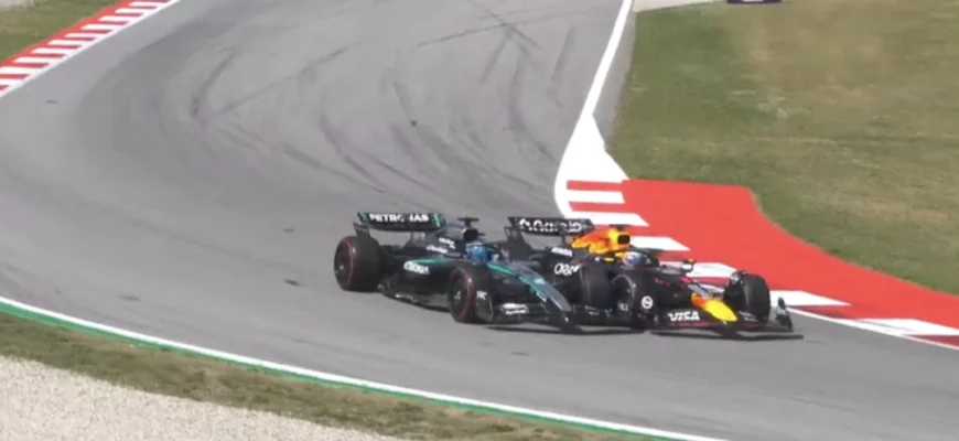 На подходе к пятому повороту на следующем круге Ферстаппен, казалось, собирался уступить позицию Расселлу, но затем снова ускорился перед апексом и столкнулся с болидом Mercedes.